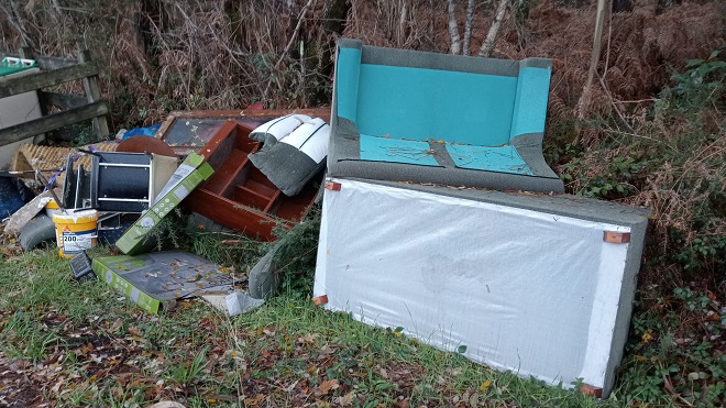 Unha porta vella, un bote de pintura baleiro, tres sofás, un moble de madeira, caixas de cartón, unha cadeira, coxíns, o recheo dun colchón e algúns obxectos máis apareceron ciscados esta mañá ao pé dos colectores da capela da Portela, en San Sadurniño. Un punto de paso moi frecuentado -e relativamente resgardado- preto do límite con Narón que cada certo tempo é motivo de publicacións e avisos a través das redes sociais municipais, precisamente, por ser foco das verteduras ilegais de voluminosos.
