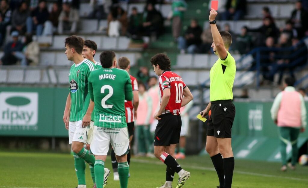 Poco después, en el minuto 55, llegó la jugada clave del partido, con la expulsión de Migue Leal tras ver la segunda amarilla por un pisotón a un rival, teniendo que consultar el árbitro el monitor. Se quedaba con 10 el Racing por un error infantil de uno de sus jugadores, en teoría, más experimentados. Entraron Mardones y Saúl por David Concha y Azael para recomponer el equipo.