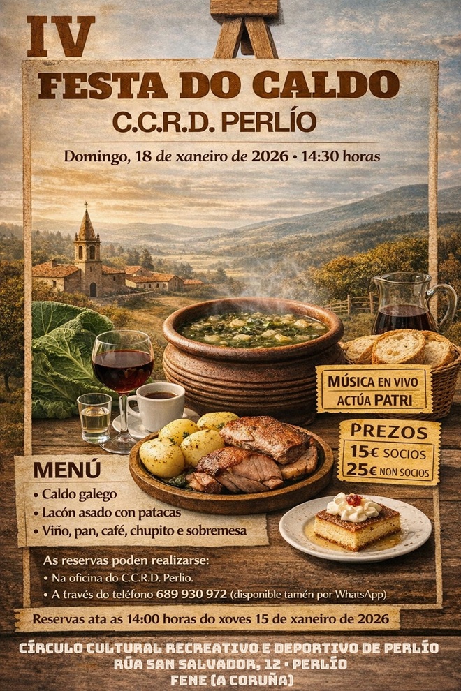 El Círculo Cultural Recreativo e Deportivo Perlío (C.C.R.D. Perlío) celebra el próximo domingo 18 de enero de 2026, a las 14:30 horas, su IV Fiesta del Caldo, una cita que se consolida en el calendario gastronómico y social de la comarca.