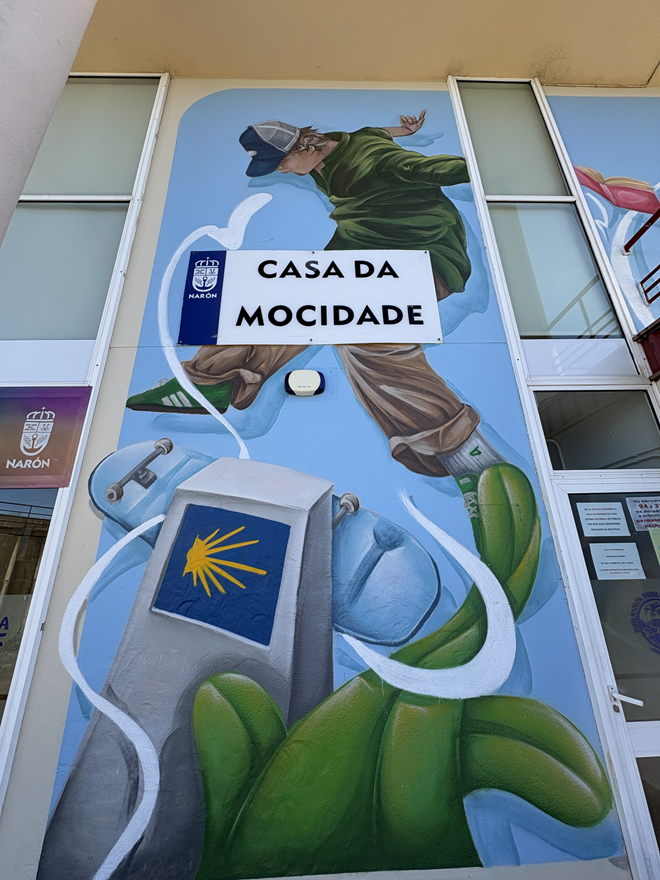 A fachada da Casa da Mocidade de Narón loce desde finais de decembro cunha nova imaxe chea de cor, movemento e mensaxe. Trátase do mural colaborativo do proxecto “Narón a toda cor”, unha iniciativa impulsada polo Concello de Narón na súa aposta pola creatividade xuvenil como ferramenta de expresión e de participación.