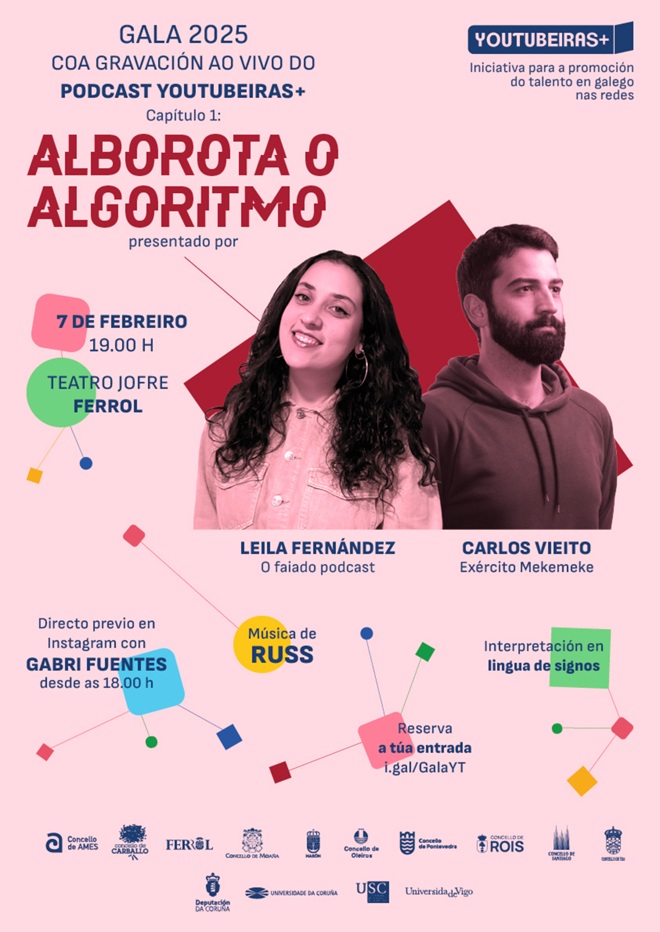 Así o Jofre acollerá a cerimonia de entrega de premios nunha gala presentada por Carlos Vieto, de Exército Mekemeke, e Leila Fernández, d’O faiado pódcast. Agra revelou que os Premios Youtubeiras+ contan por vez primeira coa categoría de Premio ao Mellor Pódcast e por ese motivo a gala significará, en certo xeito, a gravación ao vivo do primeiro episodio dun pódcast moi especial: o Pódcast Youtubeiras+.