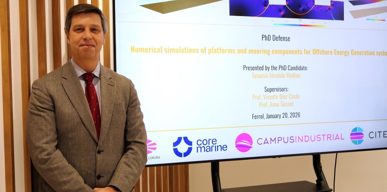 El diseño y análisis de estructuras flotantes capaces de resistir las fuerzas del oleaje y mantenerse estables en alta mar constituye uno de los principales retos de las energías renovables en mar abierto o offshore. En este contexto, Tanausú Almeida, investigador del Centro de Investigación en Tecnologías Navales e Industriales (CITENI) en el Campus Industrial de Ferrol e integrante del Grupo Integrado de Ingeniería (GII), realiza una tesis de doctorado titulada “Simulaciones numéricas de plataformas y componentes de fondeo para sistemas de generación de energía marina”. La investigación se presenta como un doctorado industrial, realizado en colaboración con la empresa CoreMarine, lo que le confiere un marcado carácter aplicado y una orientación directa a la resolución de problemas reales de la industria offshore. Forma parte también del Programa Oficial de Doctorado en Ingeniería Naval e Industrial de la UDC y cuenta con mención internacional.