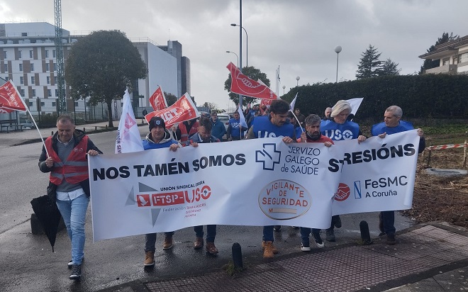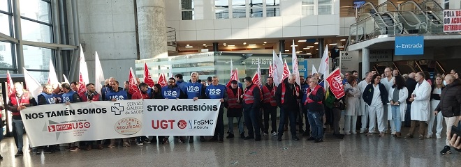 El sector de la seguridad privada en Galicia ha denunciado este miércoles en Ferrol una situación que califican de «insostenible» y, para ello, cerca de un centenar de personas –convocadas por UGT y USO– se han concentrado a las puertas del Hospital Arquitecto Marcide de Ferrol para dar visibilidad al incremento de las agresiones físicas y verbales que sufren durante el ejercicio de sus funciones en centros de salud y hospitales.
