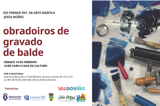 Valdoviño acoge el sábado 14 de febrero un taller de grabado dirigido a niños preferentemente a partir de 12 años y personas adultas, aunque también está abierto a niños desde los 8 años en horario de 12:00 a 14:00 horas. El taller es gratuito, con plazas limitadas e inscripción previa.