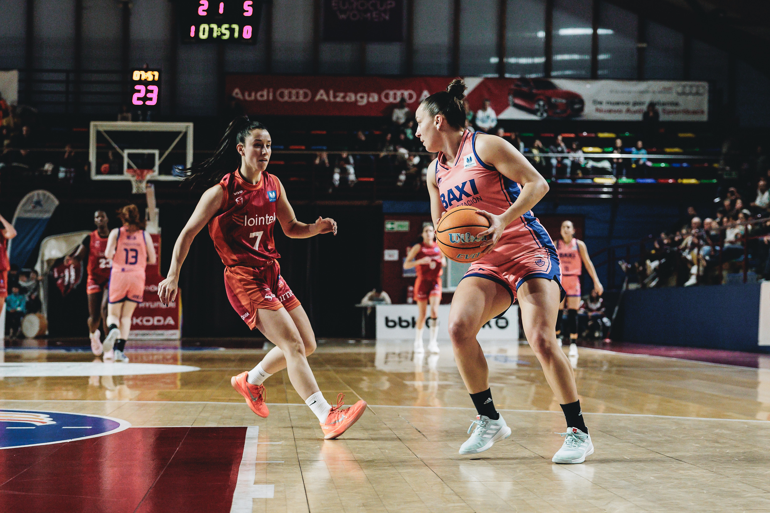 Las ferrolanas hicieron el mejor primer cuarto de la temporada, el cual vieron en su totalidad los espectadores que estaban en la instalación, al no funcionar el streaming hasta llegar a los dos últimos minutos, con una ventaja considerable del Baxi Ferrol, gracias a una buena labor desde la línea de triple consiguiendo anotar cinco de ocho lanzamientos, dos de ellos casi seguidos de Moira Joiner, como también de una gran Claire Melia en la pintura siendo una pesadilla para las jugadoras vascas, cerrándose el primer cuarto 15-30.