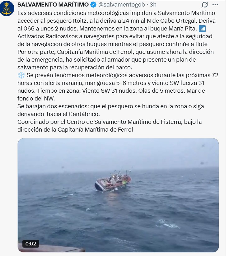 Durante las próximas 72 horas se prevén fenómenos meteorológicos adversos debido a la alerta naranja en la costa, que conlleva olas de 5-6 metros y viento SW fuerza 31 nudos. Ante esta situación, los servicios de emergencias barajan dos escenarios: que el pesquero se hunda en la zona o que siga derivando hacia el Cantábrico.
