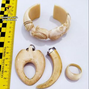 Como resultado de la operación, se aprehendió un lote de 5 figuras de elefante de diferentes tamaños y un segundo lote de 4 piezas de joyería, todas ellas elaboradas con marfil. La naturaleza del material fue confirmada posteriormente mediante un informe pericial emitido por la Unidad Técnica de la Unidad Central Operativa de Medio Ambiente (UCOMA), en colaboración con técnicos del Ministerio para la Transición Ecológica y el Reto Demográfico (MITECO).