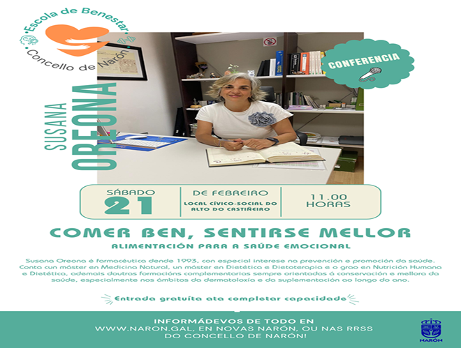 A Escola de Benestar do Concello de Narón inicia a súa programación divulgativa cunha nova actividade centrada na relación entre alimentación e equilibrio emocional. A próxima sesión terá lugar o sábado 21 de febreiro, ás 11.00 horas, no local cívico-social do Alto do Castiñeiro, baixo o título “Comer ben, sentirse mellor: alimentación para a saúde emocional”.