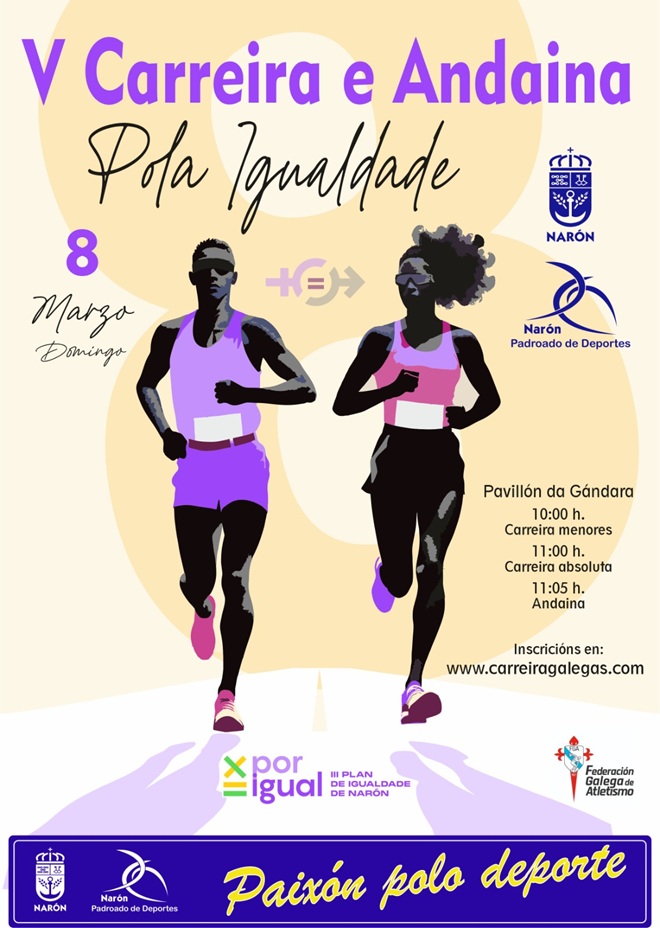 O Padroado de Deportes do Concello de Narón abriu o prazo de inscrición para participar na V Carreira e Andaina pola Igualdade, que se celebrará o domingo 8 de marzo coincidindo coa conmemoración do Día Internacional da Muller.