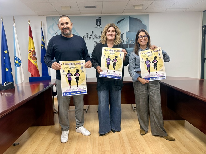 A proba foi presentada pola alcaldesa de Narón, Marián Ferreiro, xunto co concelleiro de Deportes, Ibán Santalla, e a concelleira de Igualdade, María Lorenzo, e enmárcase no III Plan de Igualdade municipal. Segundo explicaron, a xornada comezará ás 10:00 horas coas probas das categorías menores, mentres que a carreira absoluta dará inicio ás 11:00 horas.Cinco minutos despois, ás 11:05 horas, arrancará a andaina popular, unha modalidade pensada para fomentar a participación cidadá nun evento que une deporte e sensibilización social arredor da igualdade.