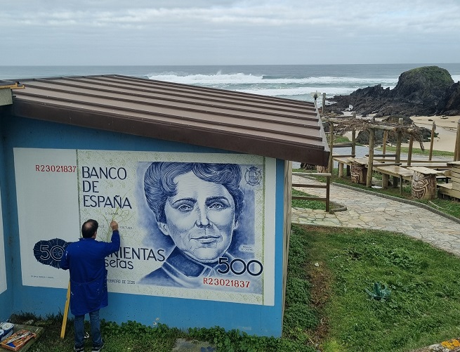 Neste novo mural, hai tamén moito detalle, e Carballeira aposta por incluír textos e imaxes orixinais, como a estampa da praia pequena no billete. Dende o Concello, anímase á veciñanza a visitar a obra festexando así este luns o Día de Rosalía.