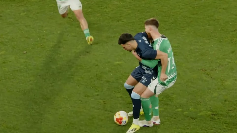 Gran inicio racinguista, alegría en las gradas, pintaba muy bien la tarde hasta que… Llegó el mordisco. Sí, lo que leen. El central racinguista Álex Zalaya decidía morder de manera persistente el brazo de Álvaro Marín justo delante del banquillo del Celta Fortuna. Los celestes enviaron al colegiado a la pantalla y el dictamen fue claro, roja (más bien granate) para Zalaya, quien se expone a una fuerte sanción tanto del Comité de Competición como del propio Racing. Mazazo moral para el Racing que aprovechó el Celta Fortuna para crecer; Álvaro Marín enviaba el balón de cabeza al larguero de Parera. Acto seguido, Hugo González rozaba el poste racinguista.