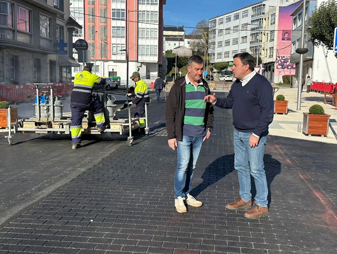 Na zona de rodadura e aparcamentos aplicarase formigón bituminoso, e nestes días executarase a impresión do aglomerado con acabado decorativo. A intervención completarase coa finalización de parte da balaustrada, a instalación de papeleiras, bancos, xardineiras,