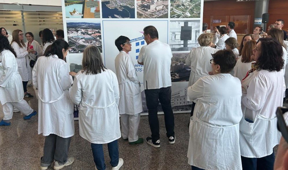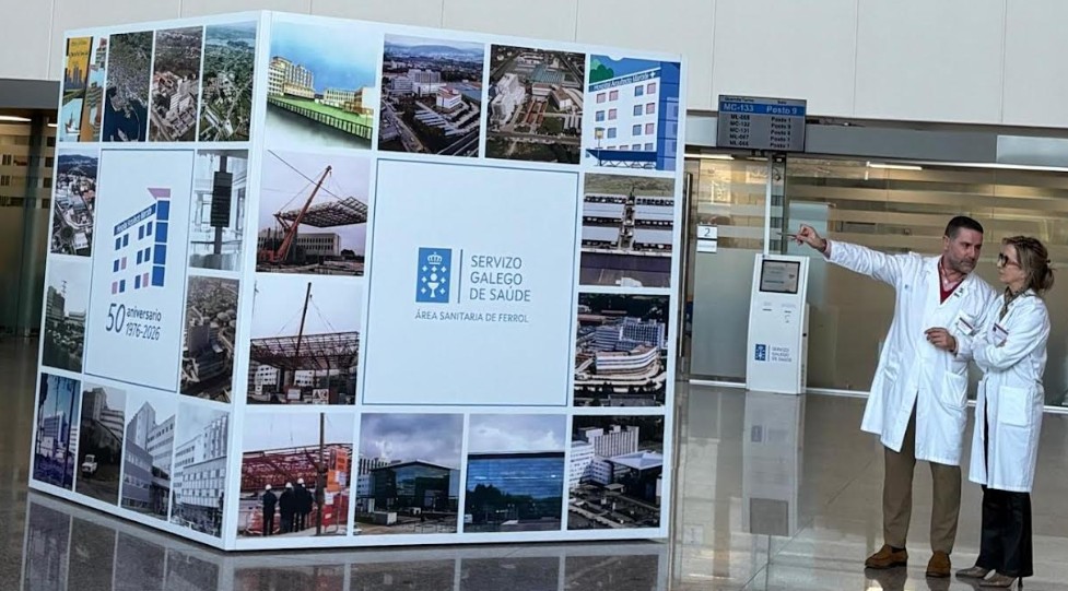 Un cubo de 2,50×2,50 metros con cuatro caras llenas de imágenes del Hospital Arquitecto Marcide del Complejo Hospitalario Universitario de Ferrol se sitúa en medio de la entrada principal de este centro hospitalario en el año de su 50 aniversario. En él, se puede ver la evolución física de este centro a lo largo de este medio siglo. Son cuatro caras con cuatro etapas. Una, la de los inicios, desde junio de 1976, año en el que se incorporaban los primeros trabajadores que arrancarían la actividad en el mes de agosto, y en la que este centro se convertía en una de las “residencias sanitarias más modernas de España”. Otra cara, cuando se incorpora el centro de especialidades, en el año 1993, en la que muchos de los especialistas pasan desde el Ambulatorio Fontenla Maristany a ejercer su actividad en un edificio en forma de ele que hacía crecer el centro original. Una tercera cara, ya recién estrenado el siglo XXI, muestra cuando se unían estos edificios con una gran cubierta central, el actual espacio del corredor principal de cristal, en el año 2001. Se constituía así un único centro, y cambiaba ya totalmente el aspecto de esta infraestructura hospitalaria. Por último, imágenes de cómo está mudando este centro en los últimos años y en la actualidad, con la incorporación de los nuevos edificios, el edificio sur y el edificio este, envolviendo el centro actual.