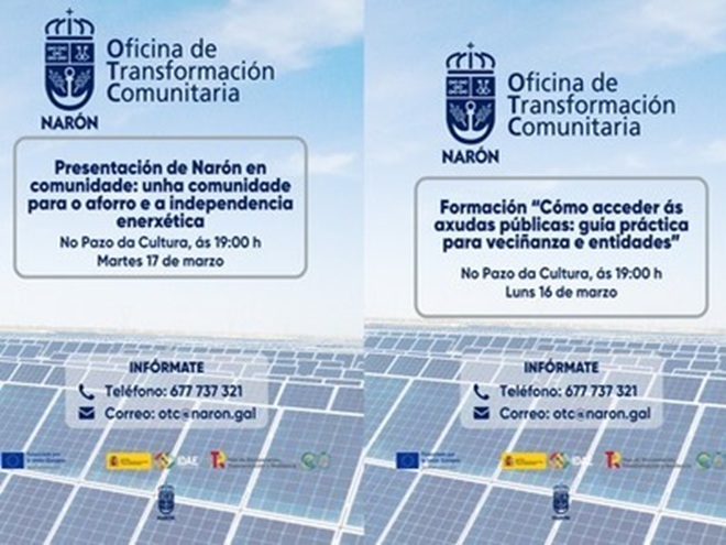 Ao día seguinte, o 17 de marzo tamén ás 19.00 horas, celebrarase a charla “Narón en comunidade: unha ferramenta para o aforro e a independencia enerxética”, na que se abordarán as posibilidades que ofrecen as comunidades enerxéticas para reducir custos e impulsar modelos de consumo compartido. Ademais destas sesións divulgativas, o Concello anima á cidadanía a participar nunha enquisa destinada a coñecer mellor as necesidades, intereses e expectativas da poboación en materia enerxética.