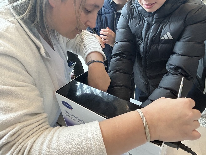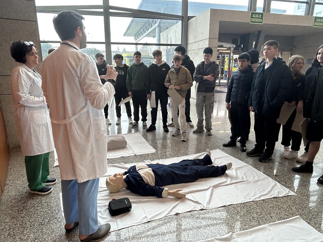 Ó finalizar os relatorios, o alumnado trasladouse á entrada principal do Hospital Arquitecto Marcide para as seguintes estacións de actividades, talleres de simulación de RCP (Reanimación Cardiopulmonar) a cargo de profesionais da Unidade de Coidados Intensivos do CHUF; e talleres de Lavado de mans, orientados pola enfermaría de Medicina Preventiva da Área Sanitaria de Ferrol.