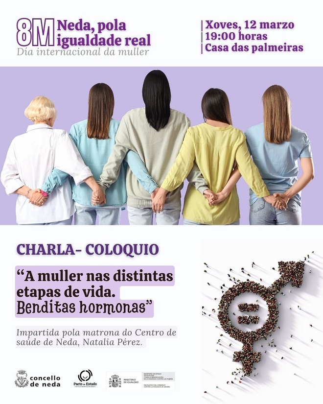 El Ayuntamiento de Neda organiza este jueves, 12 de marzo, en el marco de la programación especial con motivo del Día Internacional de la Mujer, la charla coloquio “A muller nas diferentes estapas da vida. Benditas hormonas”. La propuesta, impartida por la matrona del centro de salud de Neda, tendrá lugar en la Casa das Palmeiras.