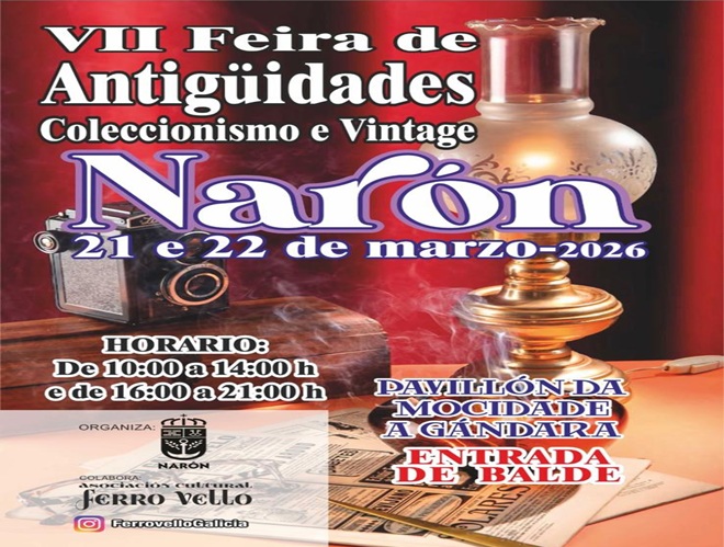 Narón celebra os próximos 21 e 22 de marzo a súa VII Feira de Antigüidades, Coleccionismo e Vintage, unha cita xa consolidada no calendario local que reunirá no pavillón da Mocidade da Gándara a profesionais e afeccionados chegados de diferentes puntos de España.