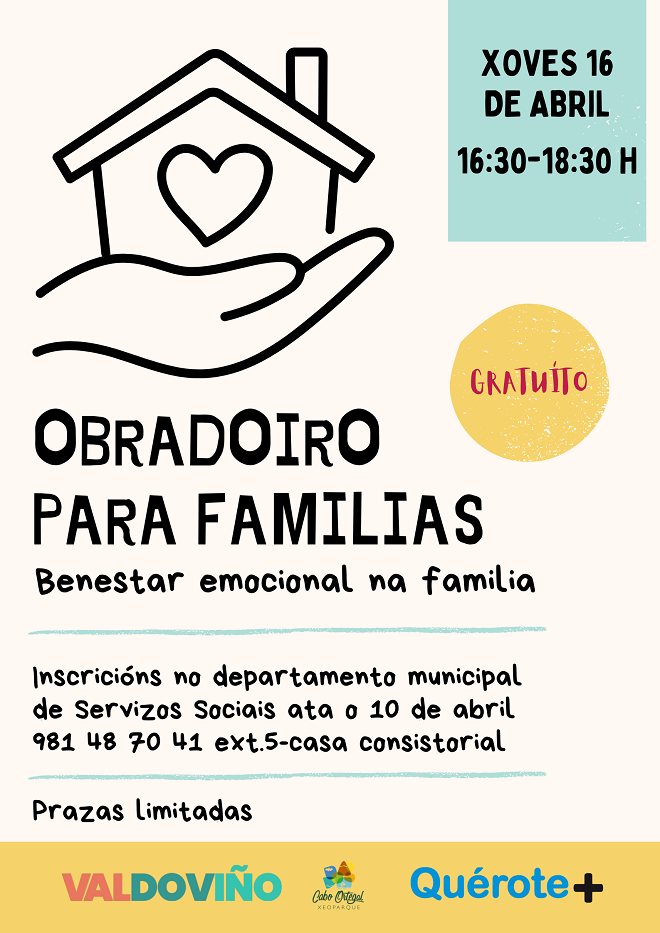 El Ayuntamiento de Valdoviño, junto al centro Quérote+ , organizará el jueves 16 de abril el taller «Bienestar emocional en la familia». Personal técnico del centro dependiente de la Xunta se encargará de guiar la sesión, que se celebrará en la casa consistorial de 16:30 la 18:30 horas.