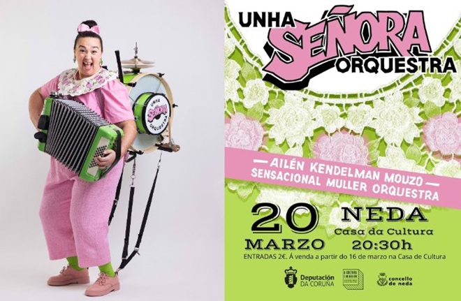 A artista e creadora escénica Ailén Kendelman estrea a vindeira semana en Neda “Unha señora orquestra”, un singular espectáculo no que unha única intérprete acciona varios instrumentos á vez mediante un curioso sistema de mecanismos, cordas e roldanas. A proposta mestura ritmos galegos, músicas do leste e folclore latinoamericano nun espectáculo musical cheo de humor, participación e espírito festivo.