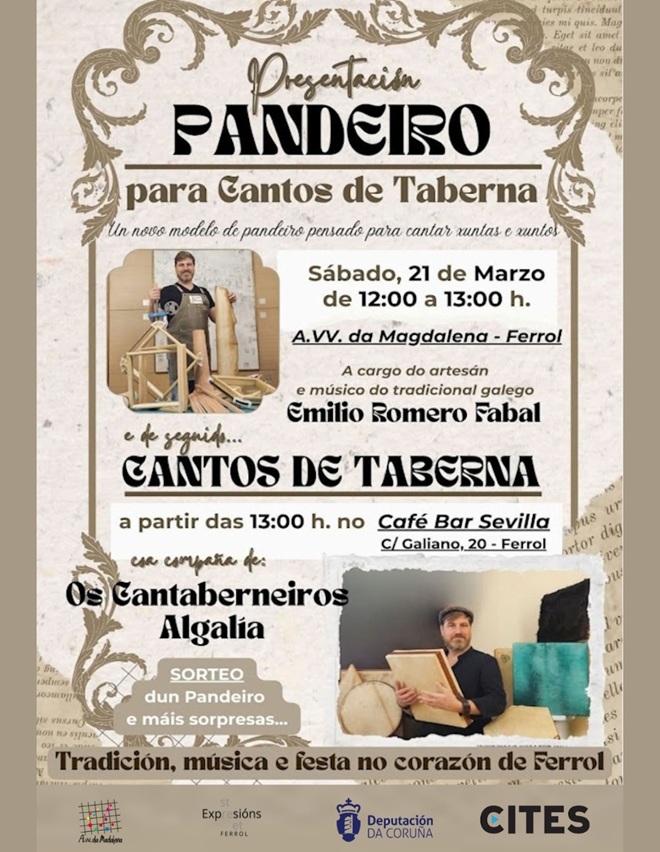 Organizado por Cites Ferrol grazas ao programa Ferrol Cidade Aberta ás Expresións que financia a Deputación da Coruña, o músico e divulgador Emilio Romero Fabal presenta este sábado 21 de Marzo un proxecto que nace da unión entre tradición e evolución: un pandeiro deseñado para os Cantos de Taberna.