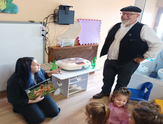 A Aula da Natureza-Punto de Atención á Infancia recibía esta semana a visita dos técnicos da Asociación Avimós. Como cada ano dende hai xa 8, regresaban ao centro para facerlles entrega da incubadora na que se formarán os pitiños da raza galiña de Mos nos próximos 21 días. Xunto ás educadoras Montse, Rosi e María, os pequerrechos e pequerrechas seguían con máxima atención as instrucións para garantir os coidados precisos que garantizarán un correcto funcionamento do aparello, como humidade, temperatura e ritmo de volteo.
