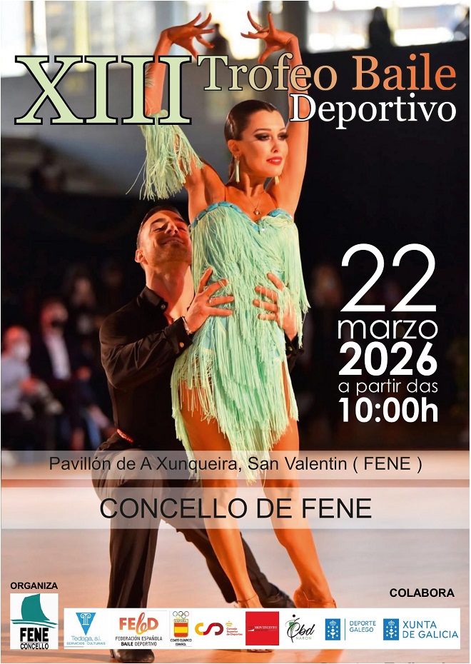 Este domingo 22 de marzo se está desarrollando el «XIII Trofeo de Baile deportivo – Concello de Fene», que en esta edición será también sede del «Circuito Ibérico ICO 2026» (Competición conjunta de España y Portugal) y en el que participarán 600 bailarines y bailarinas en las categorías de bailes caribeños, danza coreográfica, standard, single y latinos.