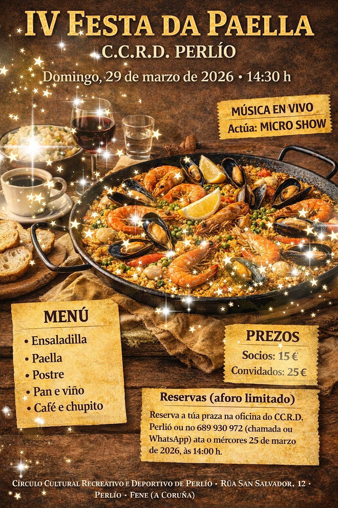 El Círculo Cultural Recreativo y Deportivo de Perlío (C.C.R.D. Perlío) celebrará el domingo 29 de marzo de 2026, a las 14:30 horas, la IV Fiesta de la Paella, una convocatoria ya consolidada en el calendario social de la entidad.