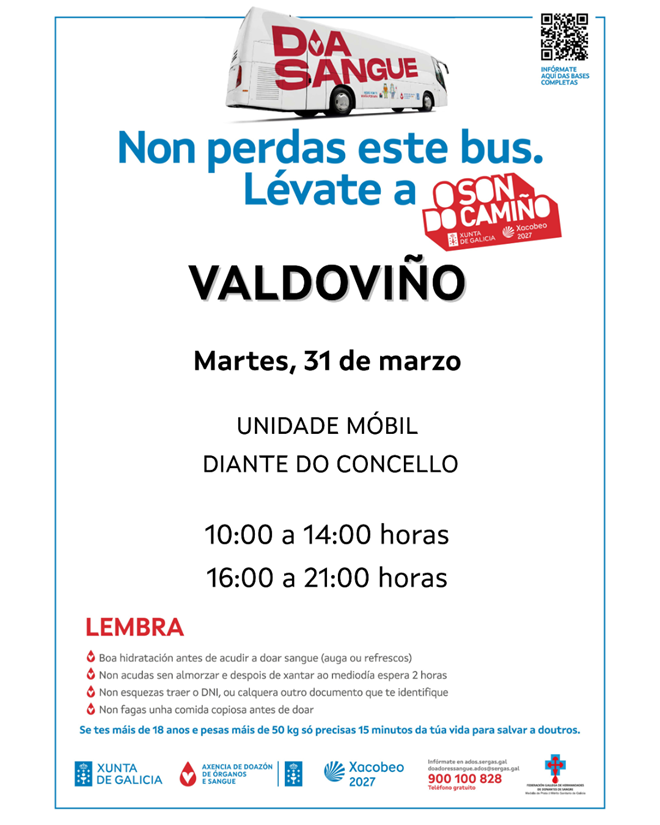 La unidad móvil de donación de sangre visita Valdoviño el próximo martes 31 de marzo, y permanecerá delante de la casa consistorial de 10:00 a 14:00 horas y de 16:00 a 21:00 horas. En esta ocasión, el gesto solidario con el que podremos contribuir a salvar vidas también podrá llevar a la ciudadanía al festival O Son do Camiño.