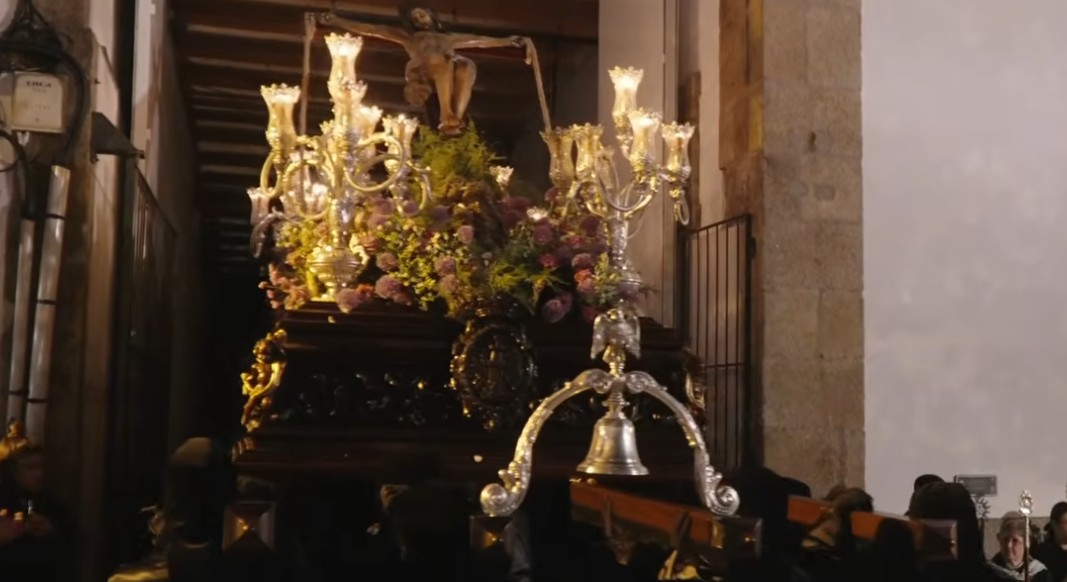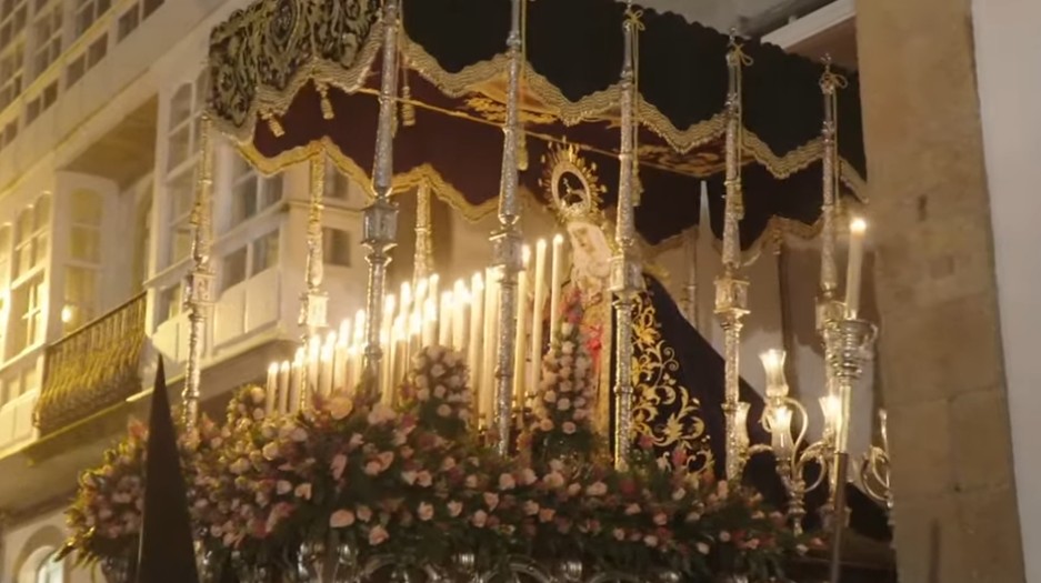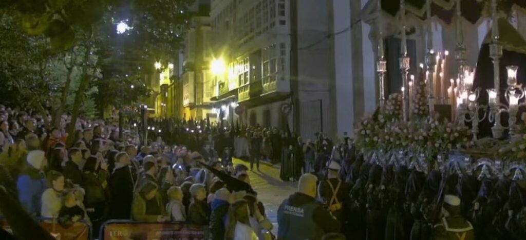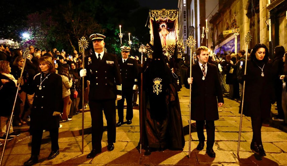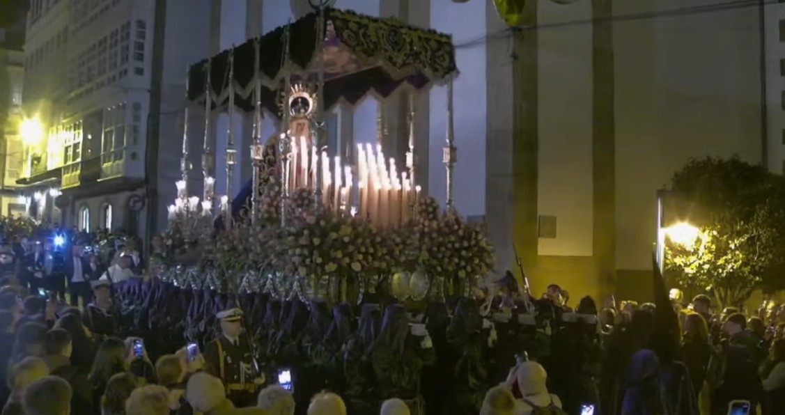 El magnífico “trono” de Cristo Rey, obra de los talleres de Cándido Hermida, portaba la imagen restaurada en los talleres coruñeses de Carmen Aguado de Soutomaior. La imagen pertenece al colegio del mismo nombre, que desde el año 1984 la cede a la Cofradía de Dolores para salir en sus desfiles.
