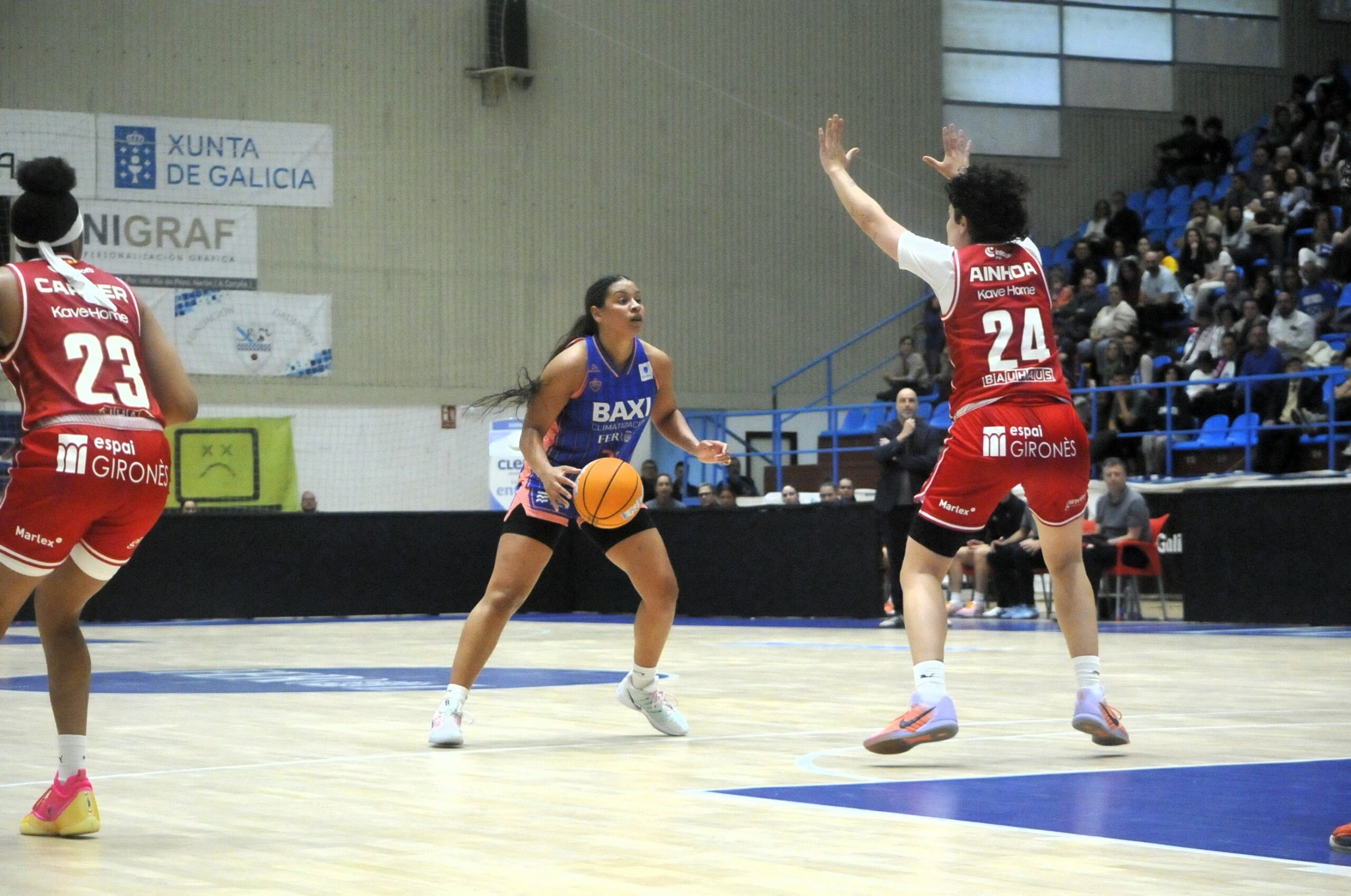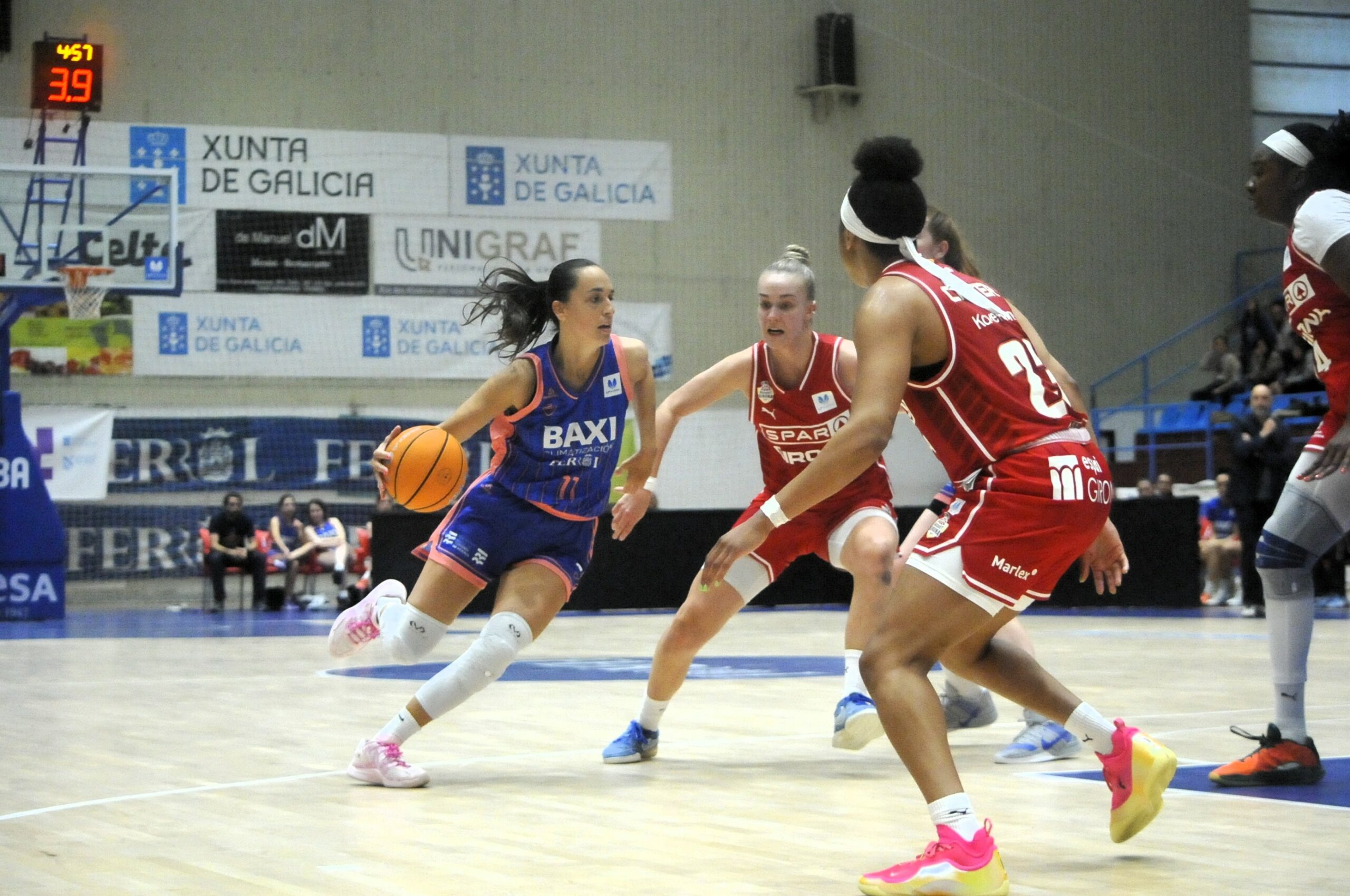 La cosa estaba complicada para el Spar Girona, pero no bajaban los brazos, planteando unos últimos minutos broncos en el juego, con el objetivo de reducir las diferencias sobre la pista, aprovechando el cansancio de las jugadoras ferrolanas debido a sus pocas rotaciones, llegando a dejarla en tan solo seis puntos. A Malata se encendía con cada acción y con algunas decisiones arbitrales polémicas, pero el Baxi Ferrol no entraba en este juego, con un importante triple de Claire Melia que dejaba el partido encarrilado, antes de ver su quinta falta, en una decisión que solo hacía aumentar el voltaje de la parroquia ferrolana, pero conseguían realizar una buena defensa dejando el marcador final en el 75-67.