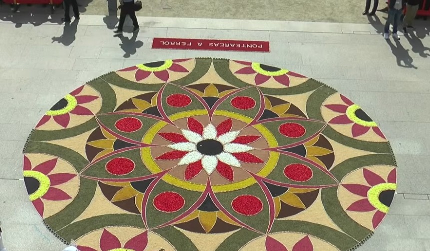 En la zona frontal al Palacio Municipal También este año, la Asociación de Alfombristas de Corpus Christi de Ponteareas estuvieron en Ferrol este día para elaborar una alfombra floral de unos 50 metros cuadrados en la plaza de Armas,ante el Palacio Municipal, donde se celebró el Gozoso Encuentro. Cabe señalar que la entidad se afanó por realizarla el pasado año, pese a las malas condiciones meteorológicas que obligaron a suspender la procesión. Un total de 21 personas acudieron para realizar este trabajo el domingo.