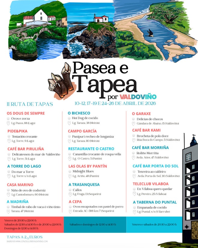 A partir de este viernes 10 de abril, un total de 18 establecimientos de hostelería de 7 de las 8 parroquias de Valdoviño participan en la segunda edición de Pasea e Tapea organizada por el Ayuntamiento.