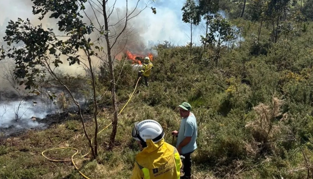 En el lugar del incendio, una zona de difícil acceso, se encuentran un agente, tres brigadas compuestas por cinco forestales cada una, con dos motobombas así como un equipo de cinco bomberos de Ferrol.