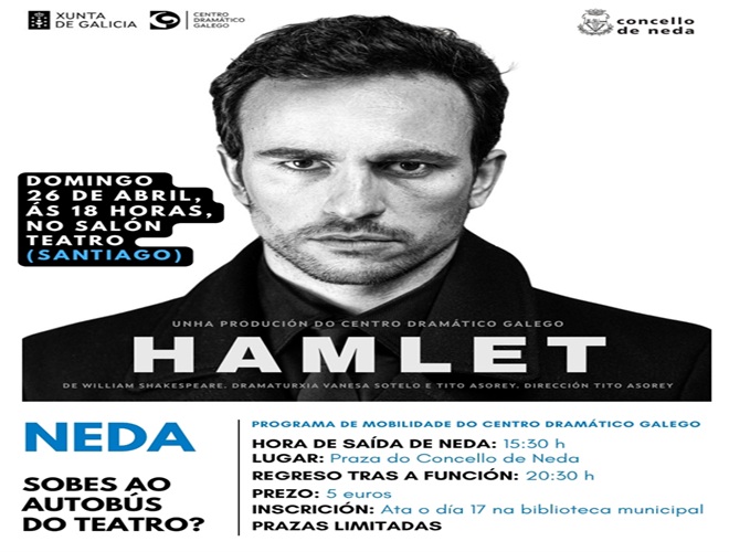 Tras a boa acollida que tivo a recente viaxe á capital galega para desfrutar da estrea de “Memorias dun neno labrego”, o Concello de Neda fretará un bus para asistir o 26 de abril pola tarde á posta en escena da “Hamlet” no compostelán Salón teatro. Está aberto o prazo para inscribirse na biblioteca.