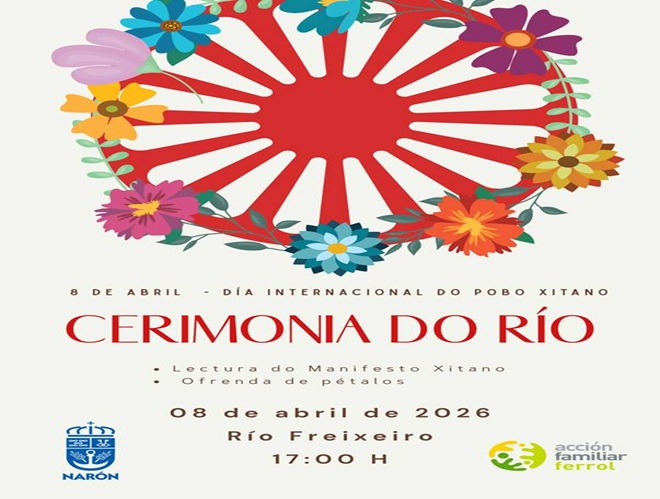 O Concello de Narón participa este mércores 8 de abril, na Cerimonia do Río organizada por Acción Familiar (AFA) Ferrol con motivo do Día Internacional do Pobo Xitano. O acto terá lugar ás 17:00 no Río Freixeiro, preto do parque, e inclúe a lectura dun manifesto e a ofrenda de pétalos.