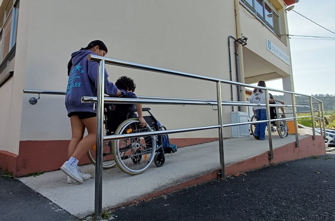 Ao longo da mañá realizaron unha auditoría de barreiras arquitectónicas do centro educativo (desnivel da rampla de entrada, ascensor, ancho das portas dos aseos e aulas…), percorreron parte das instalacións en cadeira de rodas e, posteriormente, cun anteface que lles cubría os ollos. Deste modo, puideron comprobar as dificultades que teñen que afrontar as persoas con problemas de mobilidade e de visión.