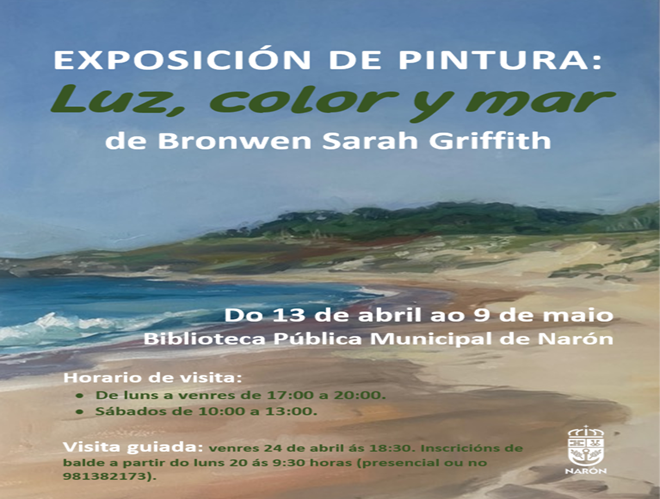 O Concello de Narón inaugura este luns ás 17:00 horas na Biblioteca Municipal a exposición “Luz, color y mar”, da pintora Bronwen Sarah Griffith, unha proposta artística que se enmarca na programación especial de Abril, mes do libro.