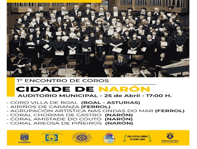 O Auditorio Municipal de Narón acolle este sábado 25 de abril, a partir das 17:00 horas, o I Encontro de Coros Cidade de Narón, unha cita que reunirá sobre o escenario a seis formacións corais co obxectivo de poñer en valor esta tradición musical inserta no tecido cultural da cidade.