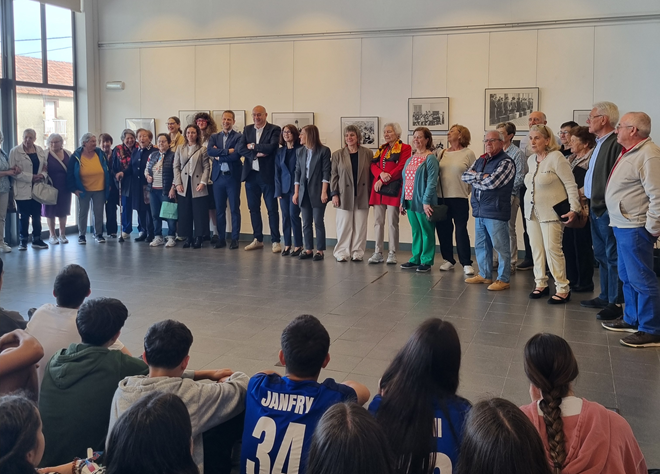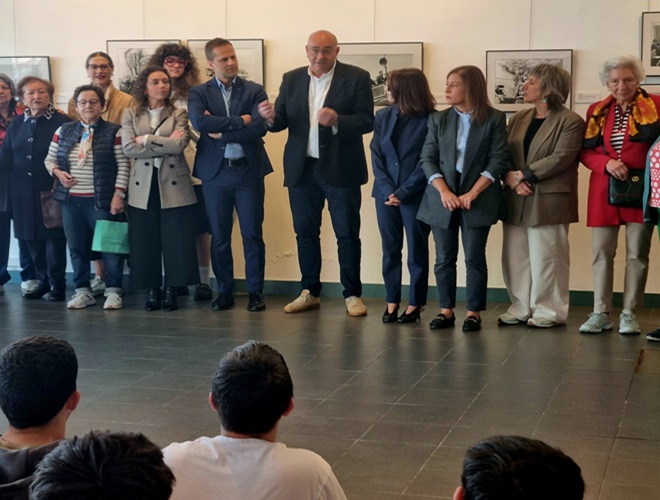 Alcalde e representantes de Abanca inauguraron a mostra na casa da cultura coa asistencia de alumnado da ESO do CPI Atios, dos talleres de estimulación cognitiva do concello e do Espazo +60.