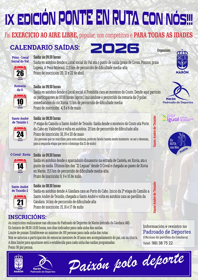 Desde este enclave, ás 11.00 horas, iniciarase o percorrido tradicional da romaría polas inmediacións do río Xuvia ata a capela da Virxe da O, cun itinerario de 11 quilómetros e dificultade media. O prazo de inscrición para participar permanecerá aberto entre os días 4 e 6 de maio nas oficinas do Padroado de Deportes.
