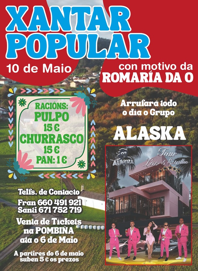 Ao longo da xornada festiva oficiaranse varias misas e celebrarase o tradicional xantar popular nas inmediacións da capela. Este ano serviranse racións de polbo e churrasco a un prezo de 15 euros. Os tíckets poden adquirirse ata o 6 de maio no local social A Pombiña. No apartado musical, a xornada contará con diferentes actuacións ao longo do día, entre elas a da Banda de Gaitas do Padroado da Cultura.